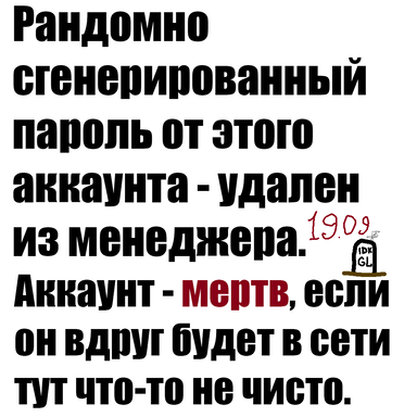 Все, всем гл, квотить смысла нет, писать в лс смысла нет, аккаунт регнут на разовую почту, пароль длинной в 26-38 символов включая спец-символы - сгенерирован и успешно удален из менеджера, после логаута, Я никогда не смогу получить к нему доступ. на случай если по какой-то причирне он появится онлайн - это буду не я.