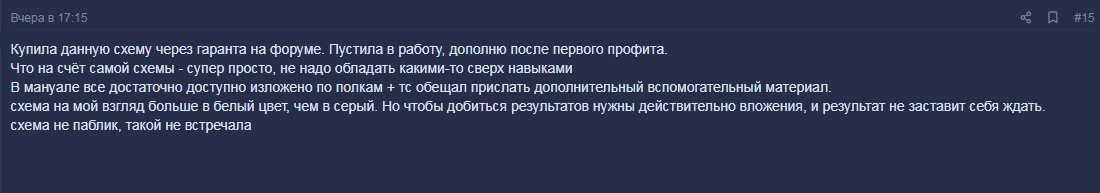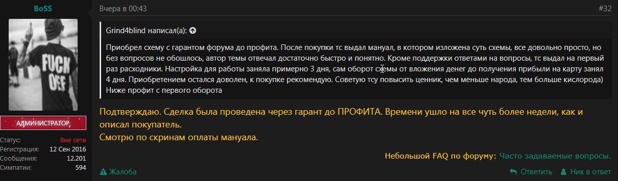 С продавцом возникла неоднозначная ситуация. Перед тем как купить схему я уточнил несколько раз по ГЕО и про гражданство которое нужно для работы по схеме. Продавец уверял что на гео пофиг и можно работать везде онлайн. Если нужен дроп, то предоставит бесплатно. На этом и ударили по рукам и я приобрел схему. К моему удивлению, дроп понадобился сразу. И был предоставлен сразу же. На этапе подготовки все шло гладко (не могу раскрывать детали схемы, но на моменте регистрации автор даже был согласен физически предоставить помощь в распечатке доков). Ок, под контролем ТС прошел регу и начал ждать апрува. День два три но апрува не получил. Начал узнавать в чем может быть дело - сказал жди. Вот прошла неделя практически. Написал отзыв. Вмешался продавец, мол так нельзя. Давай решать. Оказалось что нужно будет еще раз регенится по новой. Новые дропы согласился предоставить. Буквально час назад вышел на связь и оказалось что нужно для дропа еще и карта именная банковская. Готов предоставить для залива. Профит 50 на 50 (потом упал до 70 на 30 в мою сторону). С чем я категорически был не согласен, так как об этом и речи не шло. У меня закрались сомнения насчет этой цепочки. В разговоре не раз упоминал что я просто не хочу работать. Хотя работать я готов (слова про то что я отдал деньги за схему и не готов работать считаю смешными). Я хочу предложить дойти до профита и честно отписаться перед всеми. Плюс ТС готов за то что ввел в заблуждение предоставить расходники.