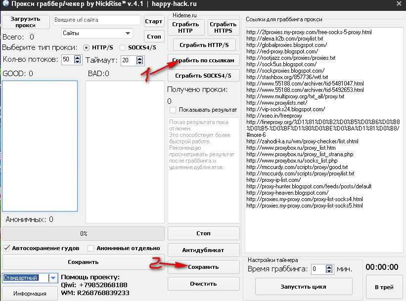 2) Собираем прокси. Для этого запускаем программу "Прокси граббер и чекер by NickRise™ v.4.1.exe" и жмякаем кнопку "Сграбить по ссылкам". Ждём пока наберётся не менее 50000 прокси, жмём кнопку сохранить и сохраняем под любым именем.
