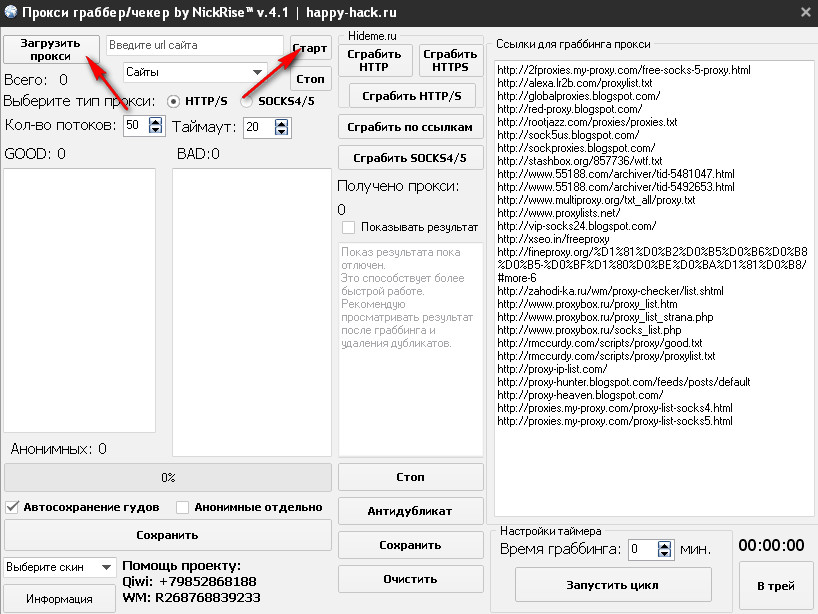 Затем жмём кнопку "Загрузить прокси", выбираем файл со сграблеными HTTP/S проксями и жмём "Старт".