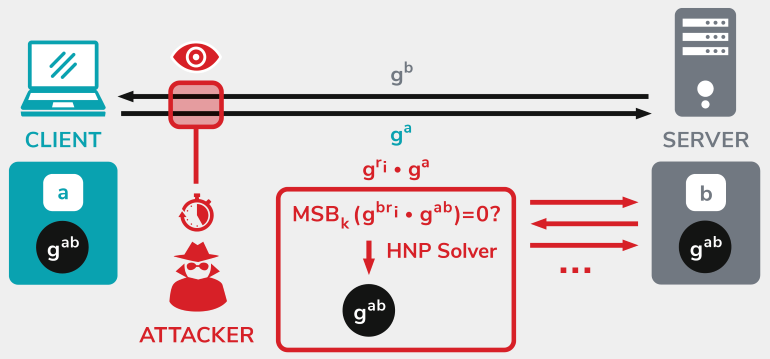 «Это помогает злоумышленнику создать систему уравнений, а затем использовать решатель для Hidden Number Problem (HNP) и вычислить pre-master secret между клиентом и сервером», —рассказывают исследователи.