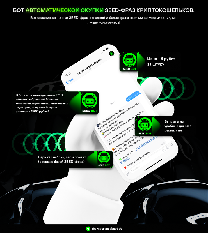В боте есть еженедельный ТОП, человек набравший большее количество проданных уникальных сид-фраз, получает бонус в размере - 1500 рублей.