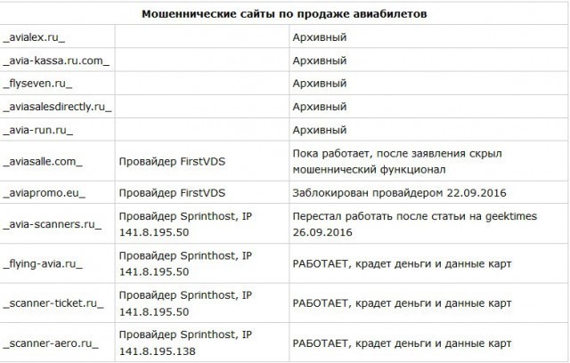Но и это еще не все. На многих мошеннических сайтах по продаже авиабилетов есть одна общая черта, однозначно объединяющая их и указывая, что они относятся к одной группе. Здесь не буду писать, что это за особенность, чтобы не помогать злоумышленникам. Но вот только некоторые мошеннические сайты из этой группы найденные за несколько минут: _avialex.ru_, _avia-kassa.ru.com_, _flyseven.ru_, _aviasalesdirectly.ru_, _avia-run.ru_, _aviasalle.com_.
