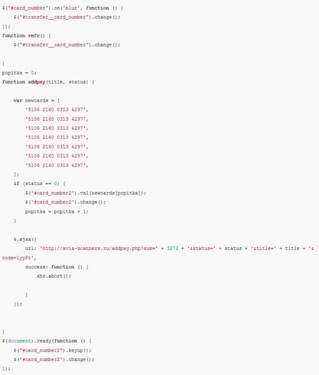 В коде задан массив с номерами карт получателей. Эти номера скриптом подставляются в форму оплаты. Теоретически может быть семь разных карт получателя и при каждой неудачной попытке оплаты номер карты должен меняться. Но, вместо семи разных номеров, задан один и тот же номер несколько раз. Т.е. при неудачной попытке следующая попытка будет с тем же самым номером карты получателя.