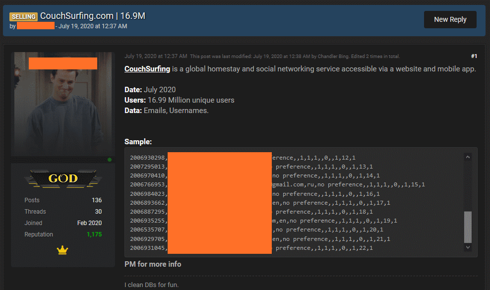 У популярного сервиса CouchSurfing, с помощью которого можно найти жилье во время путешествия (или предоставить свое жилье другим пользователям), «утекли» данные 17 000 000 пользователей. Базу продают на хакерских форумах и в Telegram-каналах за 700 долларов США.