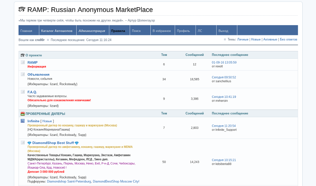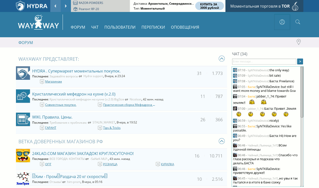 Очередной русскоязычный полуфорум-полумаркет для наркобарыг. Общение отсутствует, обсуждение взлома, безопасности, криптографии, сливов, малвари, кардинга и так далее запрещается уже при регистрации, во время которой ты обязан две минуты пыриться в этот список запретов. Вся активность на сайте сводится к торговле наркотой.
