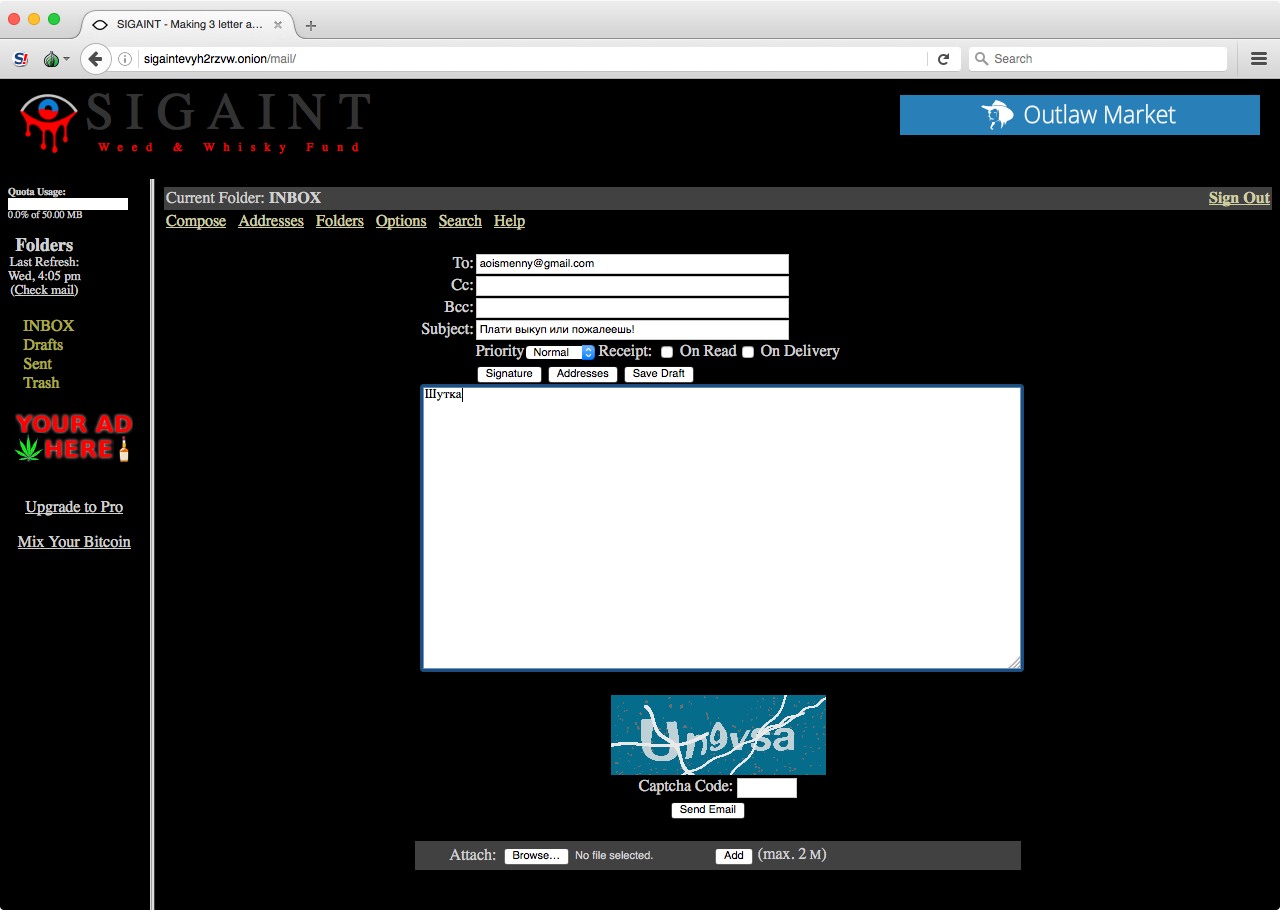 Самый популярный почтовик, который работает через Tor, называется Sigaint. Его логотип — око с угрожающими кровавыми каплями под ним. «Кровь из глаз» — это в данном случае очень точная метафора. Интерфейс прямиком из девяностых, вырвиглазная палитра, реклама, распиханная тут и там, злая капча (ее нужно вводить и при логине, и при отправке письма), ограничение на размер ящика — 50 Мбайт, проблемы с русской кодировкой при отправке писем… Короче, user experience примерно уровня средневековых пыток.