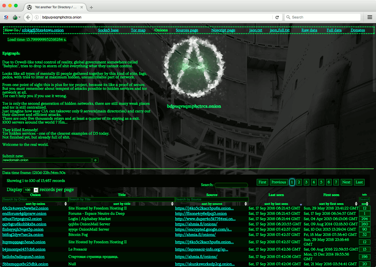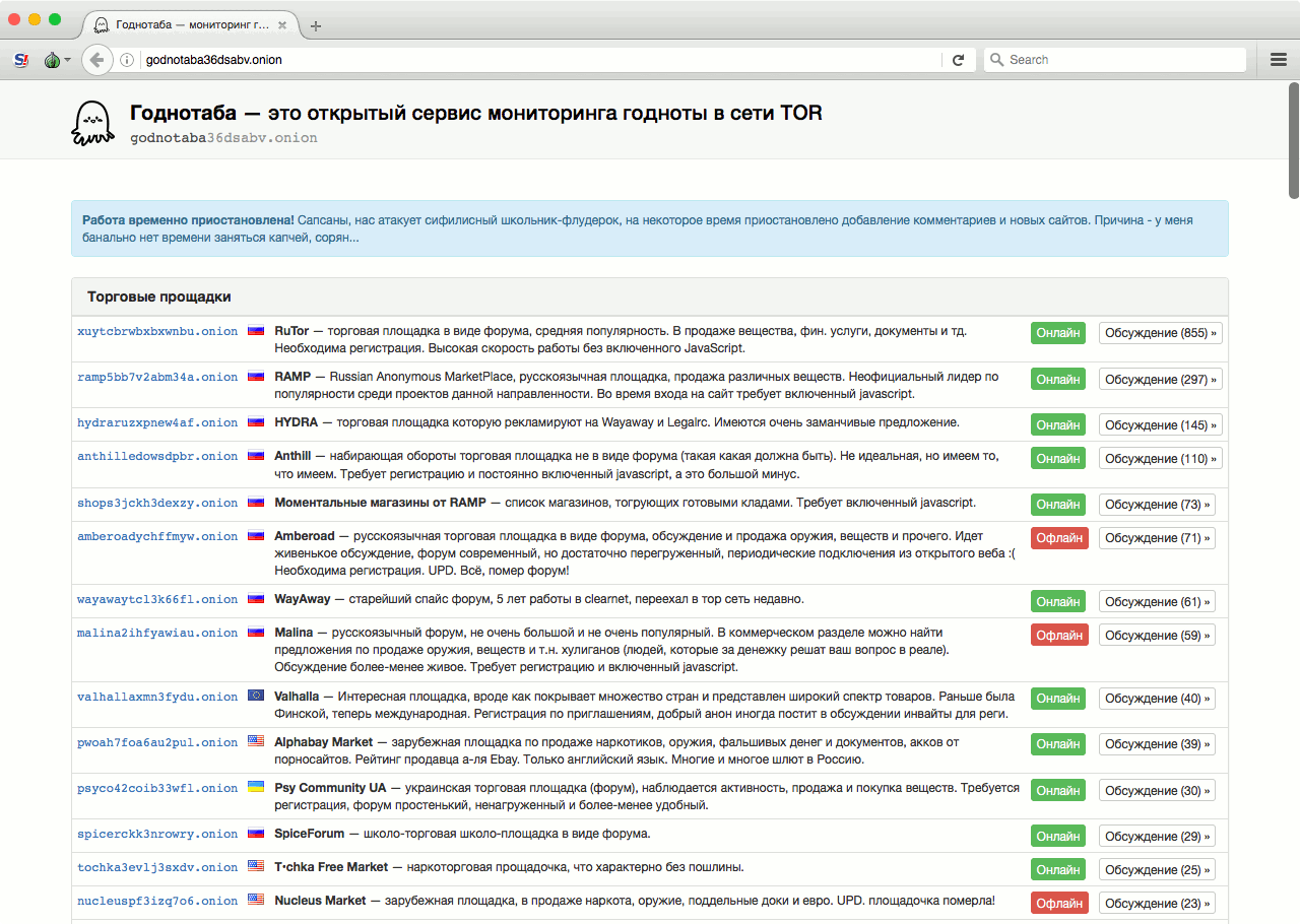 С популярными каталогами в дарквебе ситуация иная: на широко известной Hidden Wiki значительная часть ссылок не открывается вовсе, а расстановка приоритетов и принцип отбора вызывает серьезные вопросы к владельцам ресурса. Еще есть Onion URL Repository, OnionDir, Yet another Tor Directory, TorLinks, HD Wiki, русская «Годнотаба» (кстати, действительно довольно годная, хоть и небольшая) и еще сотни подборок — больших и маленьких, курируемых и не очень, размещенных как в дарквебе, так и в обычном, светлом интернете.