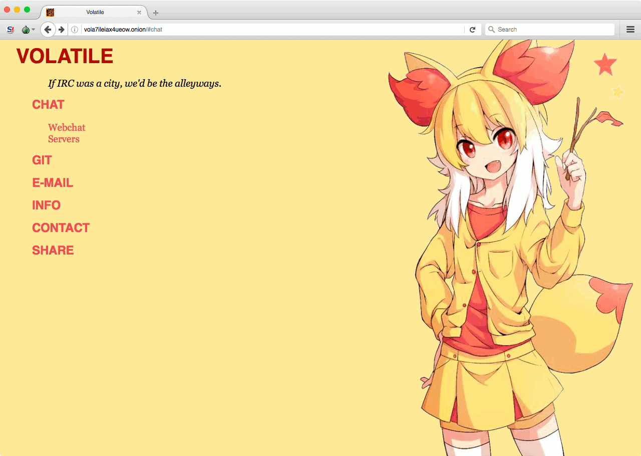 Вообще говоря, значительная часть переписки в теневой стороне интернета происходит не на сайтах, а в Jabber и IRC. Выбор пригодных клиентов, настройка анонимного подключения и поиск серверов и групп — это тема для отдельной статьи, так что здесь ограничимся лишь парой ссылок. TorXMPP, Cyruserv, securejabber.me — серверы Jabber, расположенные в Onion; CgAn IRC и Volatile — клиенты IRC, способные работать прямо в Tor Browser; ChatTor — примитивный, но удобный вебовый чат с возможностью создавать свои комнаты.