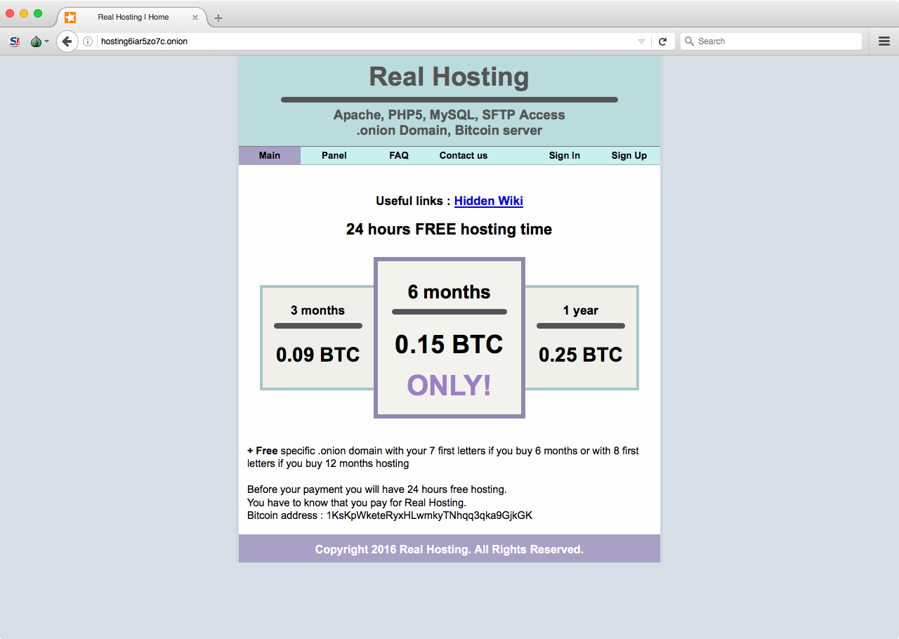 Ранний интернет отличался тем, что для желающих открыть свой сайт была масса возможностей сделать это за копейки или вовсе бесплатно — в обмен на баннер или хотя бы ссылку на хостера. В Onion ситуация иная: бесплатные хостинги не прижились, да и платные выглядят не очень-то привлекательно.