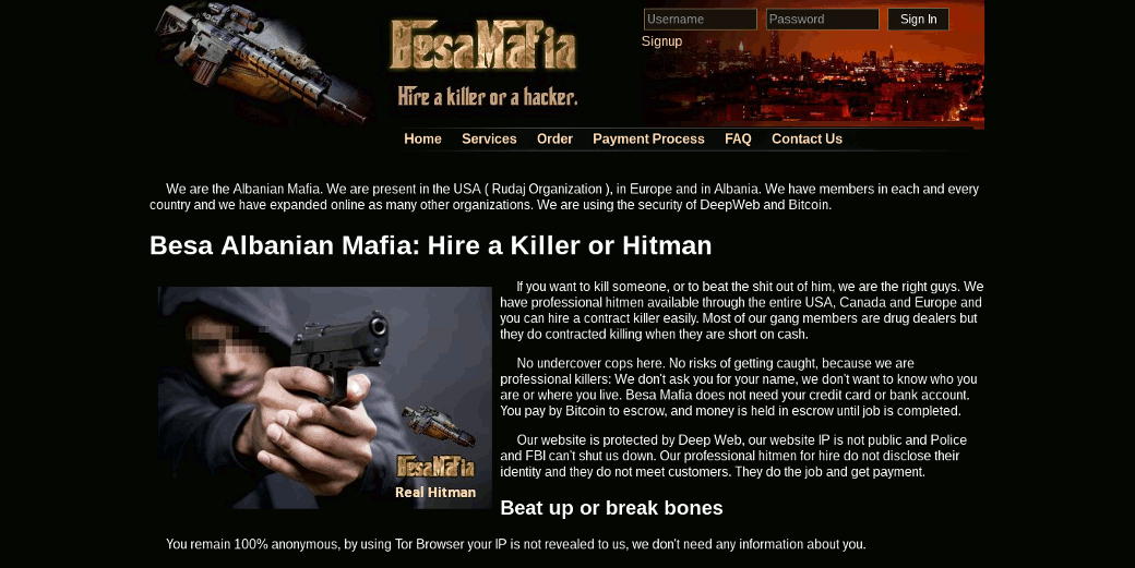 Besa Mafia действует на территории США, Канады, Европы и многих других стран, предлагая такие жестокие услуги, как выбивание долгов (с членовредительством), убийство для устрашения (впрочем, скрытное устранение тоже), поджигание автомобилей и домов, а также продажу незарегистрированного оружия. В разделах сайта можно найти инструкции по сохранению анонимности при заказе, пошаговое описание безопасного процесса оплаты заказа, прайс-лист, FAQ и даже дисклеймер, в котором заявляется, что услуги Besa Mafia предоставляются исключительно в целях защиты клиента от нависшей над ним угрозы. Чтобы сделать заказ, нужно указать контакт человека, который уже состоит в группировке, иначе ты сам можешь стать следующей целью. Создатели сайта также заявляют, что не являются исполнителями: они посредники и получают за это 20% от суммы. Исполнитель получает 80%.