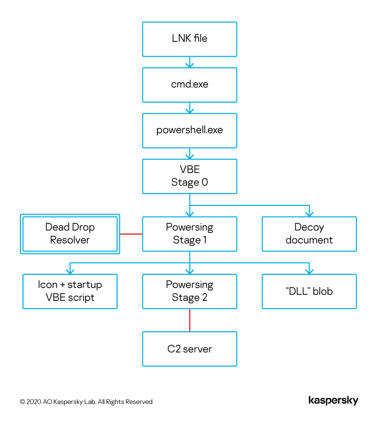 Эксперты следят за деятельностью этой группы с 2018 года и отмечают, что сейчас она стала особенно активной. Ее тактики, техники и процедуры остаются неизменными, при этом не теряют эффективности со временем: заражение происходит через фишинговые письма, содержащие архивы с вредоносными файлами. Когда пользователь нажимает на ярлык (LNK), выполняется вредоносный скрипт и происходит загрузка малвари, в результате чего атакующие получают контроль над устройством жертвы.