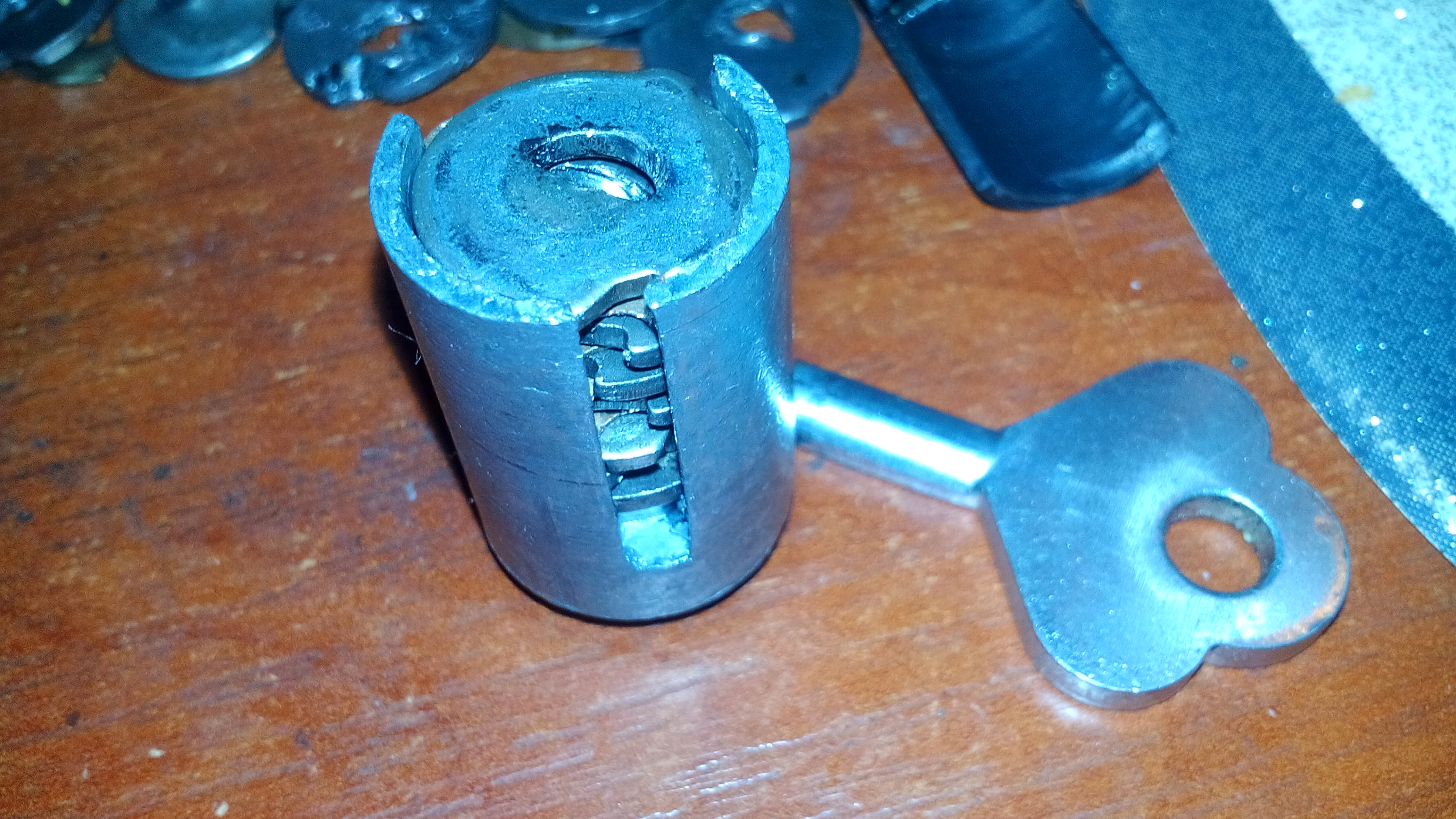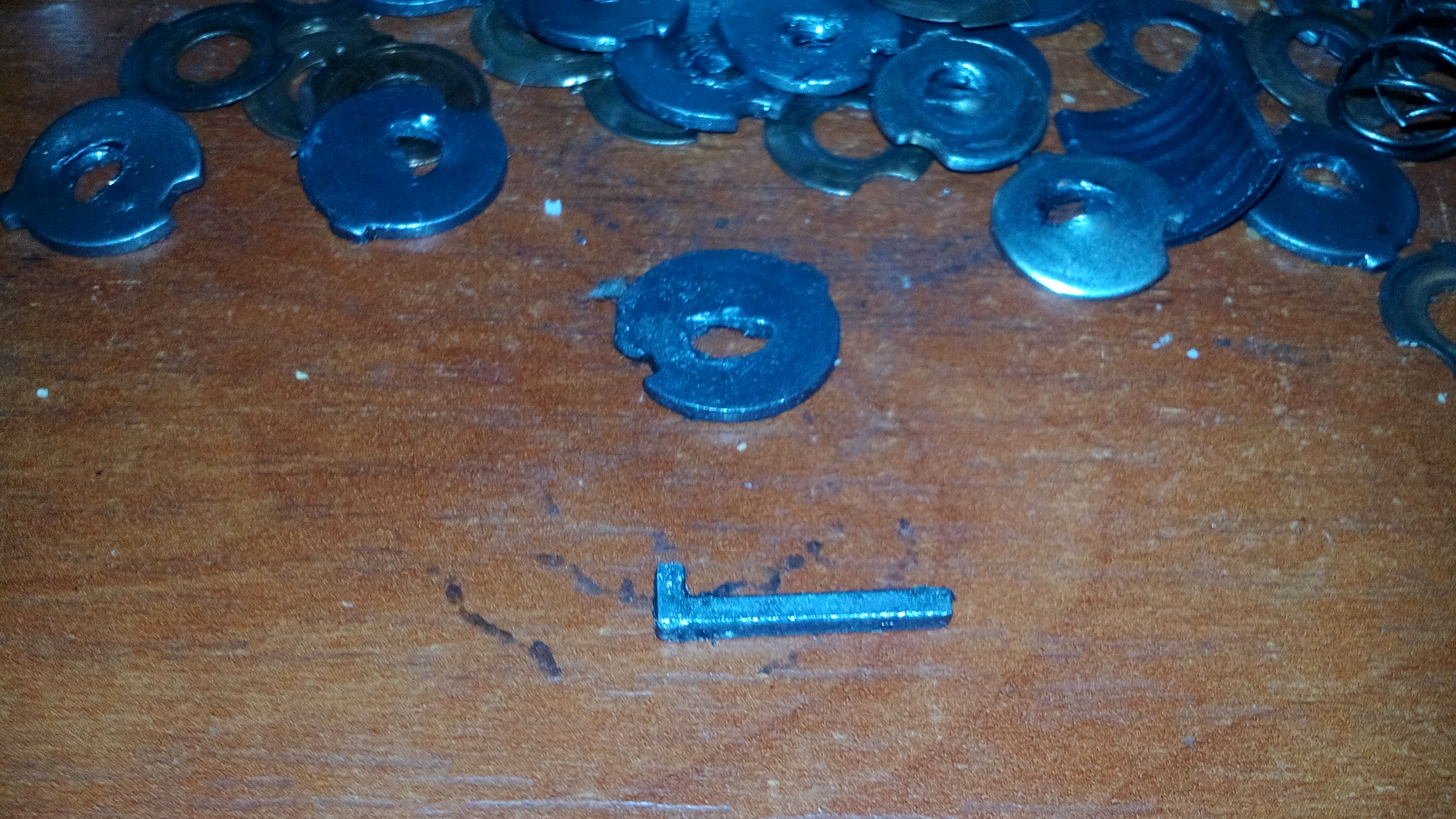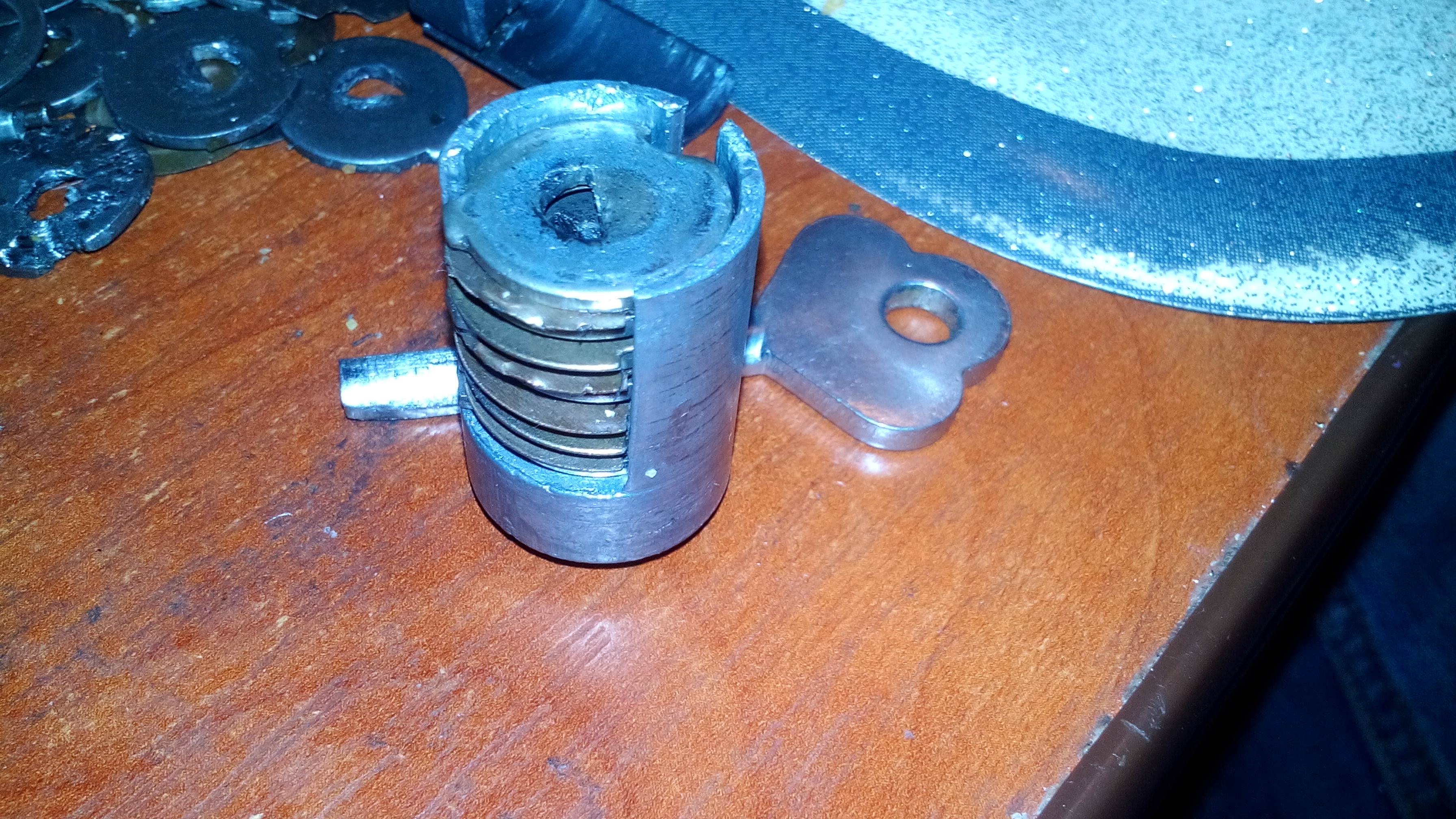 Все еще не выдернули механизм? Тогда стоит попробовать сделать несколько не слишком сильных рывков(во избежании обламывания шляпки самореза). В итоге механизм должен вытащиться и останется лишь прокрутить как и в предыдущем варианте. Замок открыт.Деформация некоторых дисков от самореза
