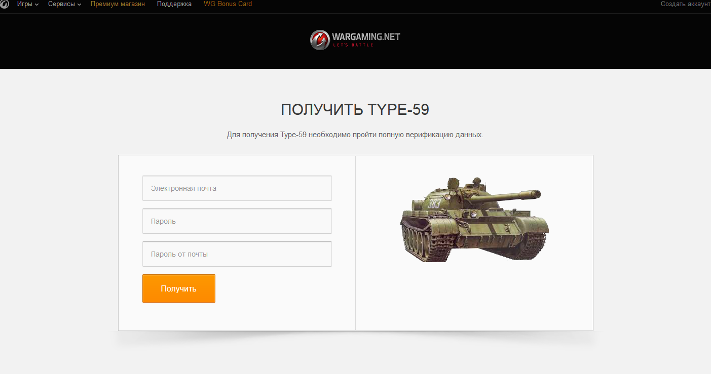 Фейк сайта Wargaming "Получить танк Type-59 бесплатно!".