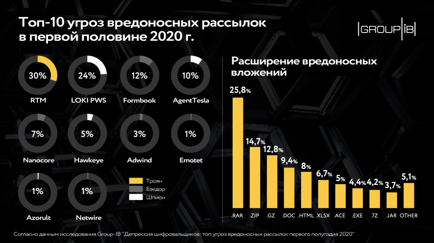Специалисты Group-IB подготовили отчет об угрозах из вредоносных рассылок в первом полугодии 2020 года. Оказалось, что со сцены практически ушли лидеры прошлого полугодия — шифровальщики, теперь они встречаются в рассылках лишь 1% случаев. Зато каждое третье вредоносное письмо содержало программу-шпиона (43% проанализированных случаев), цель которой была кража логинов, паролей, платежных данных или иной чувствительной информации с целью продажи в даркнете или шантажа.
