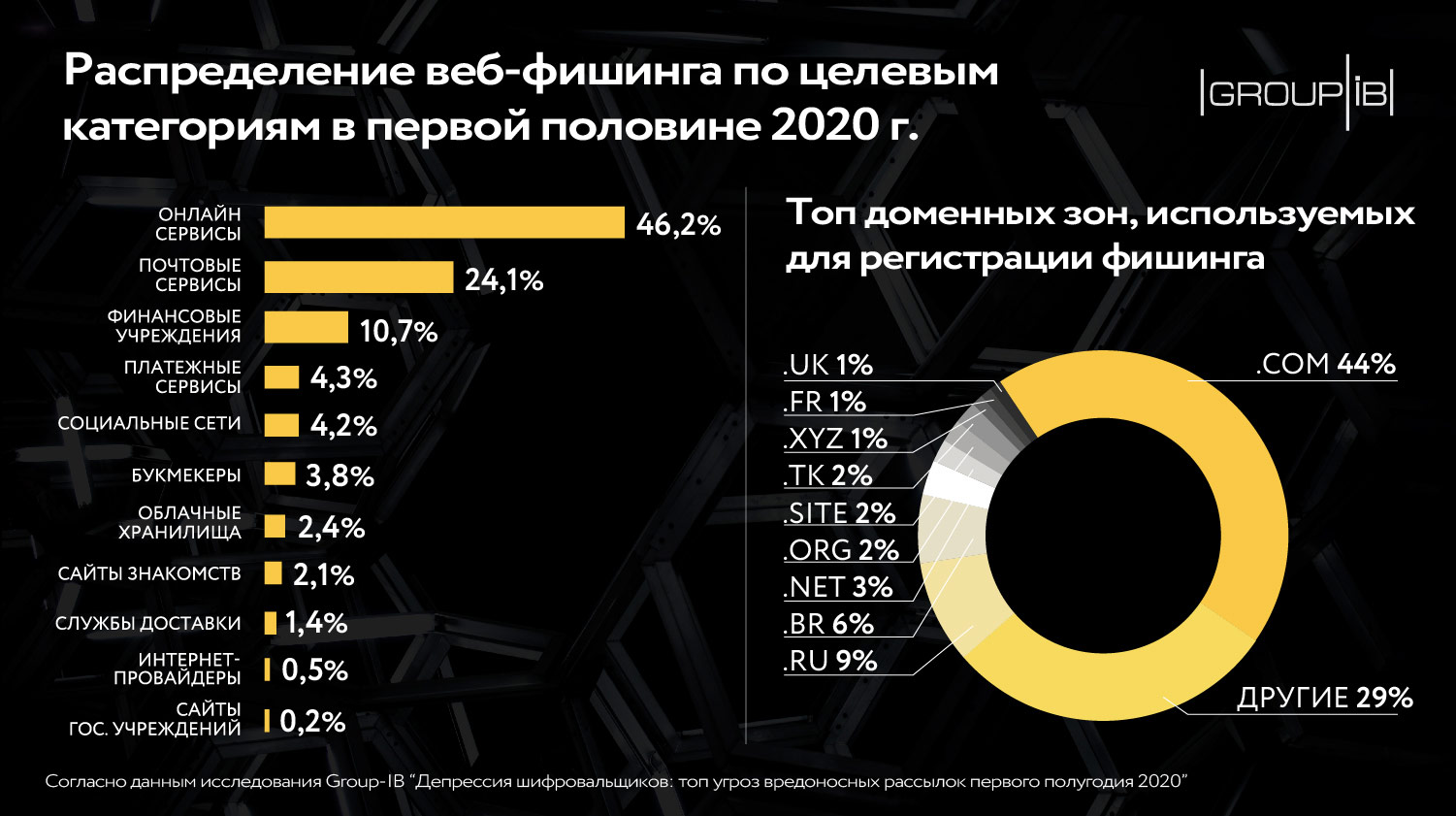 Также исследователи отмечают, что во время пандемии коронавируса вполне ожидаемо выросло количество случаев фишинга под различные онлайн-сервисы: на него пришлось 46% от общего числа фейковых веб-страниц.