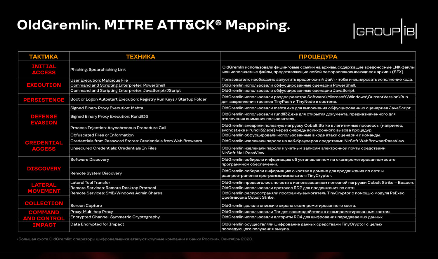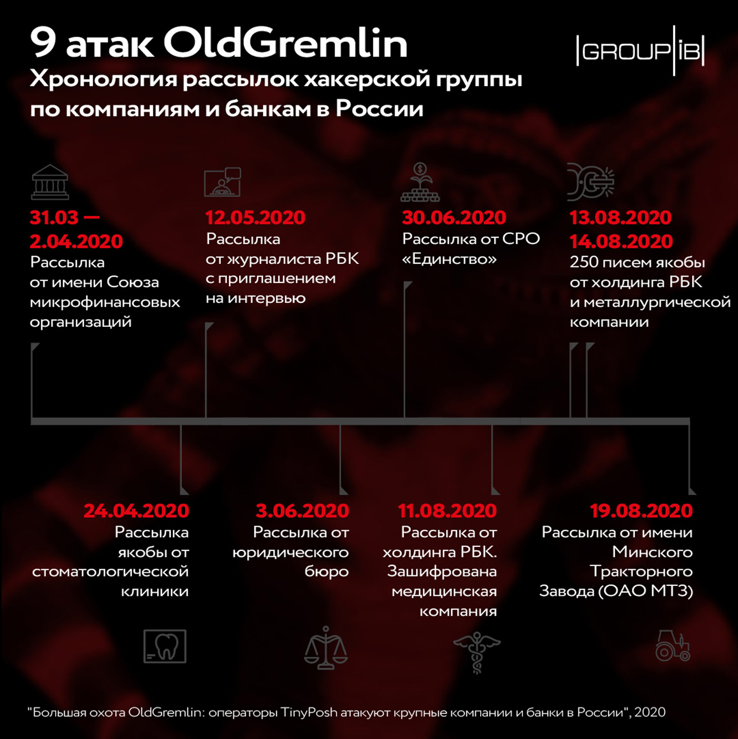 Хронология«OldGremlin — это единственная на данный момент активная русскоязычная группа-оператор шифровальщика, которая несмотря на негласный запрет „работает по РУ“ и совершает многоступенчатые целевые атаки на российские компании и банки, используя сложные, как у APT, тактики и техники. По аналогии с группами, которые „работают“ по иностранным целям, OldGremlin можно отнести к категории Big Game Hunting (Охотники за большой добычей), которая объединяет операторов вирусов-шифровальщиков, нацеленных на крупную добычу», — комментирует Олег Скулкин, ведущий специалист Лаборатории компьютерной криминалистики Group-IB.
