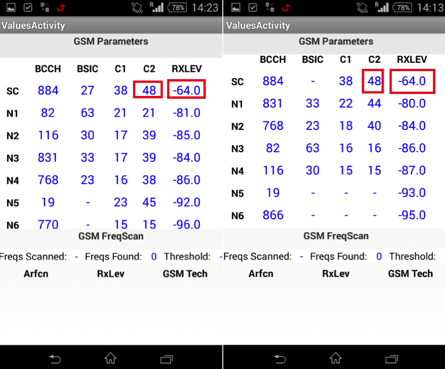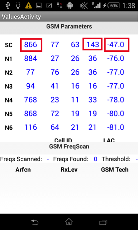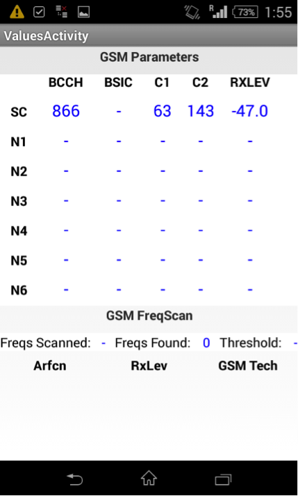Ну и немного скриншотов — список соседских и обслуживающих каналов (BCCH — arfcn, SC — serving cell, N1 — neigbour cell 1 и т. д.).