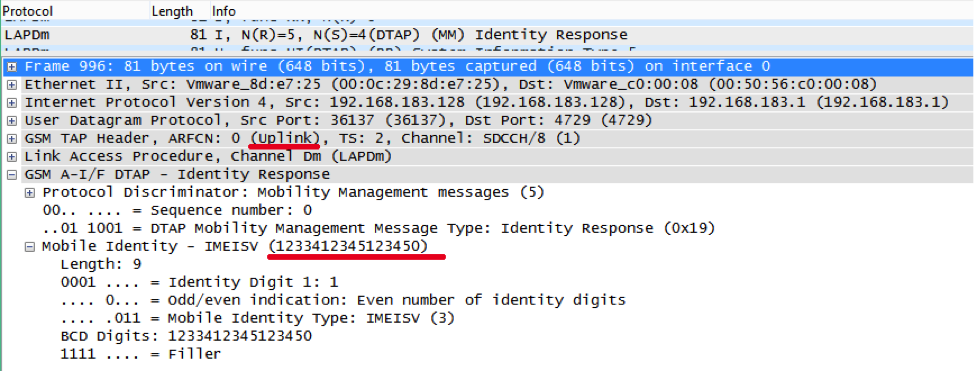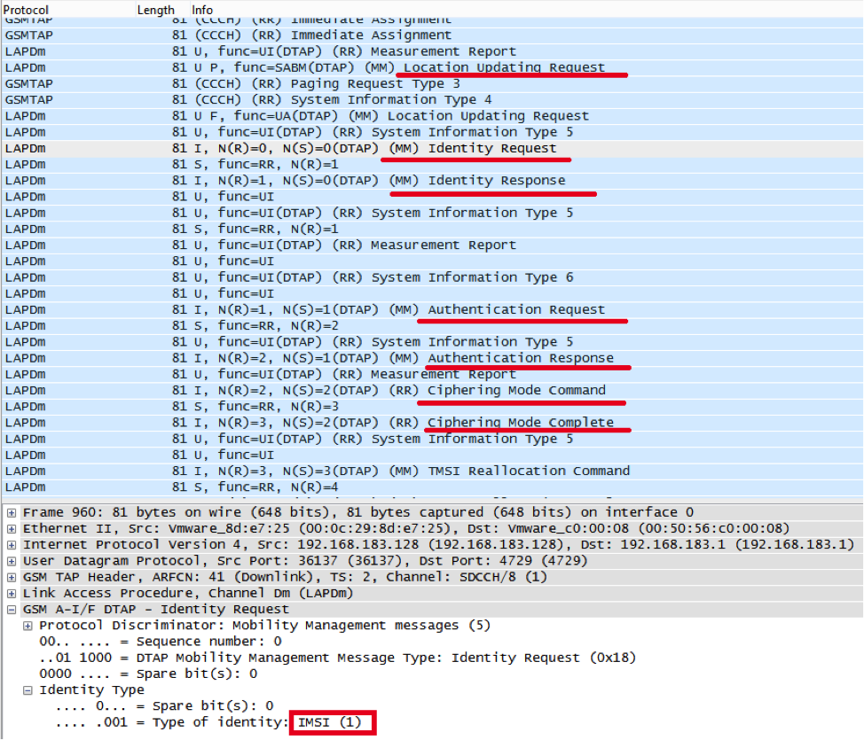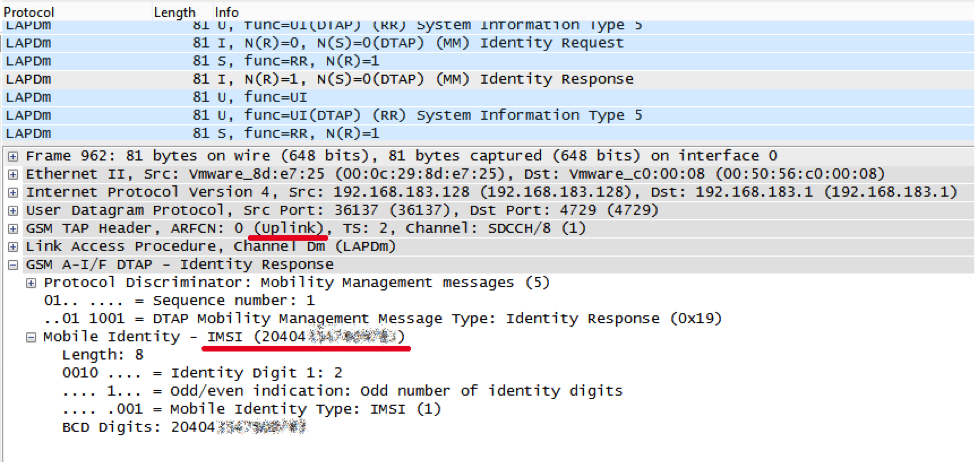 Самые внимательные могли заметить на предыдущем скриншоте запрос Identity Request перед USSD-ответом. Это сообщение используется сетью для получения от телефона IMSI либо IMEI.