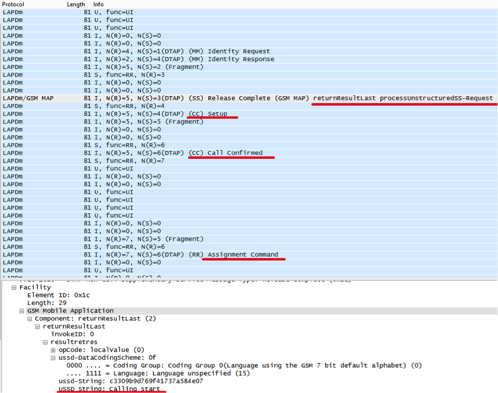 При исходящем звонке вместо сообщения установления вызова (Setup) телефон отправляет USSD с номером вызываемого абонента, который долгое время гуляет по миру, добираясь до домашних Нидерландов, потом приходит USSD-ответ с незамысловатой фразой Calling start, а затем уже идет входящий звонок с привычной последовательностью Setup, Call Confirmed, Assigned Command.
