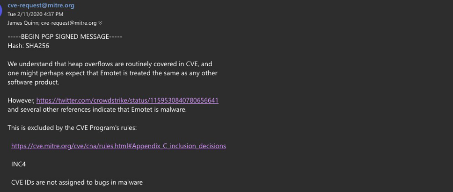 Шутки ради Джеймс Куинн и его коллеги даже обратились в MITER и попытались получить для найденной ими уязвимости в Emotet идентификатор CVE, как для любой другой уязвимости, но в организации отметили, что Emotet – это малварь и это идет в разрез с правилами присвоения CVE.