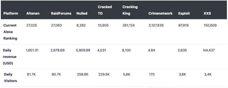 Помимо Altenen, исследователи проанализировали данные таких англоязычных форумов, как RaidForums, Nulled, Cracked TO и Cracking King, немецкоязычный форум Crimenetwork, а также русскоязычные ресурсы Exploit и XSS. Данные для анализа были взяты из открытых источников (из HypeStat и Alexa) и включали в себя рейтинг ресурса, количество уникальных посетителей за день, географию посещений, источники трафика, а также оценку ежедневного дохода. Разумеется, собранная статистика не включает в себя посещения .onion-доменов, поэтому данные нельзя назвать исчерпывающими.