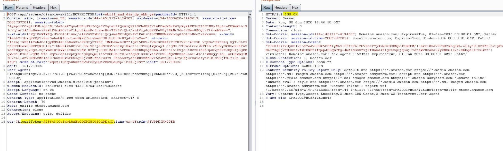 Ответ на такой запрос содержал и токен CSRF, который атакующий мог использовать для удаления одного навыка из списка. Затем злоумышленник мог таким же образом установить на устройство собственный вредоносный навык для Alexa. Подмена удаленного навыка собственным открывала перед преступником немало возможностей, в зависимости от навыков, установленных на устройстве пользователя. К примеру, можно было получить доступ к голосовой истории жертвы, а затем к именам пользователей, номерам телефонов, домашним адресам, банковским данным (Alexa не записывает учетные данные для входа в банкинг, однако фиксирует прочие взаимодействия).