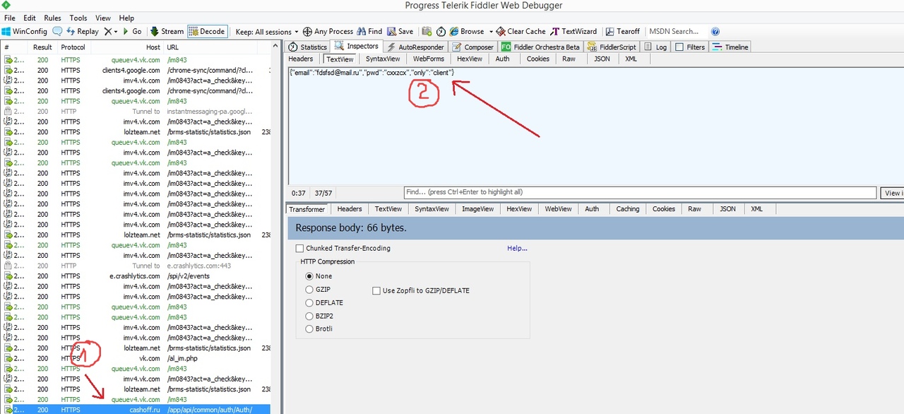 Запускаем приложение, вводим любой логин:пароль и в фидлере отлавливаем запрос на авторизацию