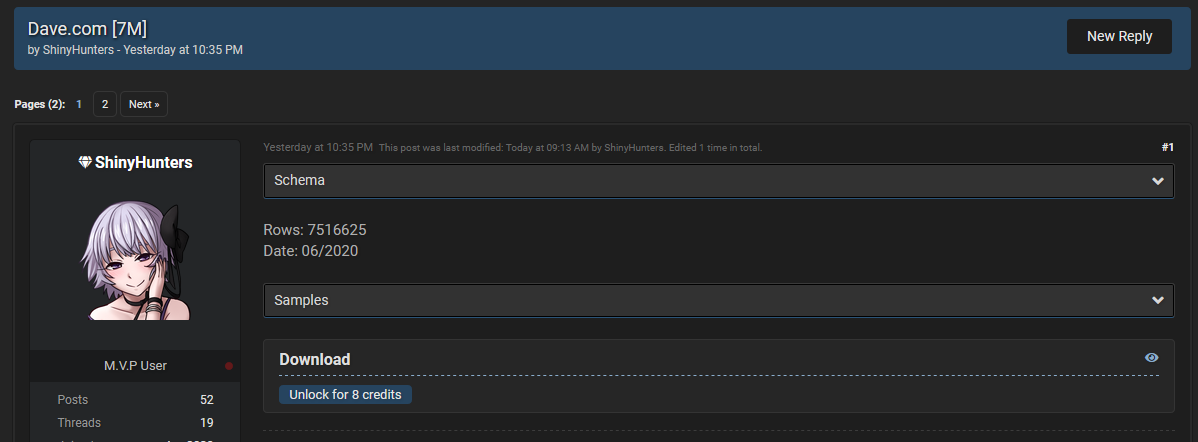 Информация о пользователях Dave была опубликована бесплатно, разблокировать ссылку для загрузки дампа можно за внутреннюю валюту (кредиты) RAID-форума.