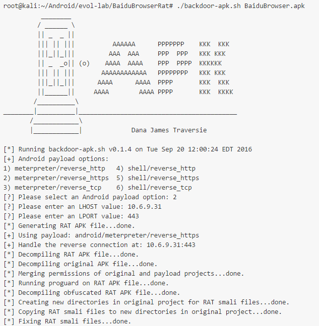Backdoor-apk одной простой командой добавляет собственный backdoor в любой APK-файл — занавес! Единственное, что необходимо, — сформировать нужное окружение для программы, чтобы она выполнила свои функции. Для этого на Linux-машине потребуется наличие Metasploit, Apktool, Android SDK, smali.