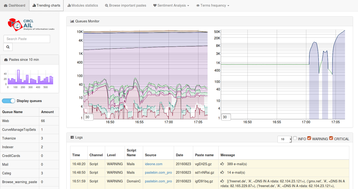 AIL — это модульный фреймворк для анализа потенциальных утечек информации в различных неструктурированных открытых источниках данных. Например, таком, как Pastebin. Благодаря своей гибкости AIL очень просто расширяется (модули на Python) новой функциональностью для обработки различной критичной информации. А благодаря крутому веб-интерфейсу он очень удобен и прост в работе. Большое количество различных схем и дашбордов позволяет быстро находить и анализировать нужную информацию.
