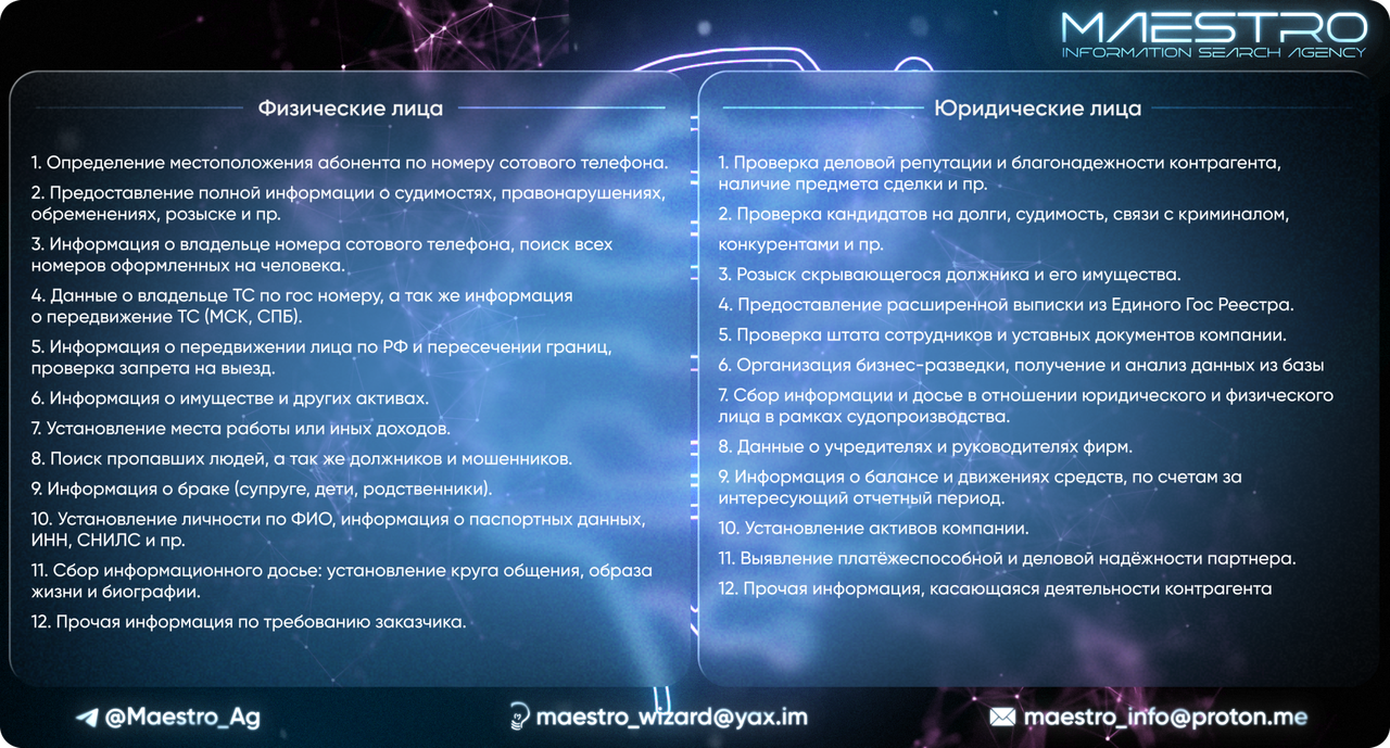 Мы специализируемся на сборе любой интересующей вас информации по РФ и СНГ.