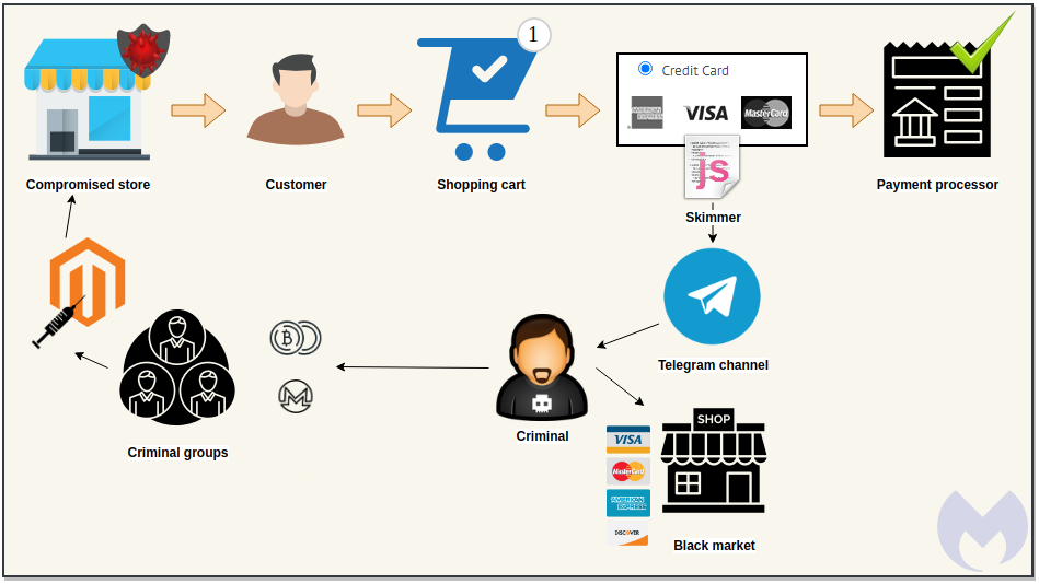 Главный исследователь из компании Malwarebytes, Джером Сегура, тоже заинтересовался данным скриптом, а изучив его, сообщил, что автор этого веб-скиммера использовал простую Base64 для ID бота, канала Telegram и запросам API. Ниже можно увидеть схему, оставленную Сегурой и описывающую весь процесс атаки.