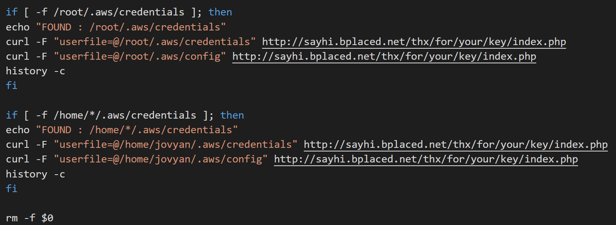 Так, если зараженные установки Docker и Kubernetes работают в инфраструктуре AWS, операторы TeamTNT осуществляют сканирование в поисках ~/.aws/credentials и ~/.aws/config, а затем копируют и отправляют оба этих файла на свой управляющий сервер. Данные файлы незашифрованы и в них, в формате простого текста, хранятся учетные данные для аккаунта и инфраструктуры AWS, а также содержатся сведения о конфигурации.