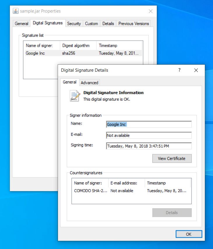 Изучив найденный файл, эксперт пришел к выводу, что малварь представляет собой файл MSI с добавленным к нему Java JAR. Как можно увидеть на скриншоте ниже, хотя файл MSI был изменен и переименован в файл JAR, Windows по-прежнему считала, что он подписан действительным сертификатом Google.