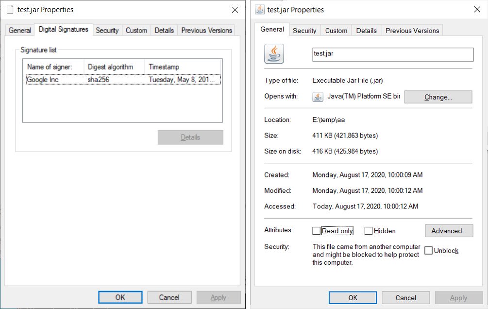 Теперь, после выхода патча для CVE-2020-1464, Windows более не считает файлы MSI подписанными, если те были изменены путем добавления JAR. Ниже можно увидеть, как реагирует на такие файлы Windows 10 1909 (слева) и новая Windows 10 2004 (справа) ниже.«Данный вектор атаки протестирован на последних и обновленных версиях Windows 10 и Java, доступных на момент написания статьи (Windows 10 версии 1809 и Java SE Runtime Environment 8 Update 191). Microsoft решила, что не будет устранять эту проблему в текущих версиях Windows и дала разрешение рассказать об этом случае и наших выводах в блоге», — писал Куинтеро в 2019 году.