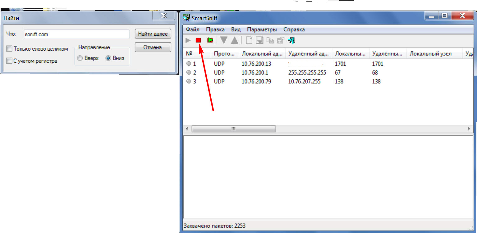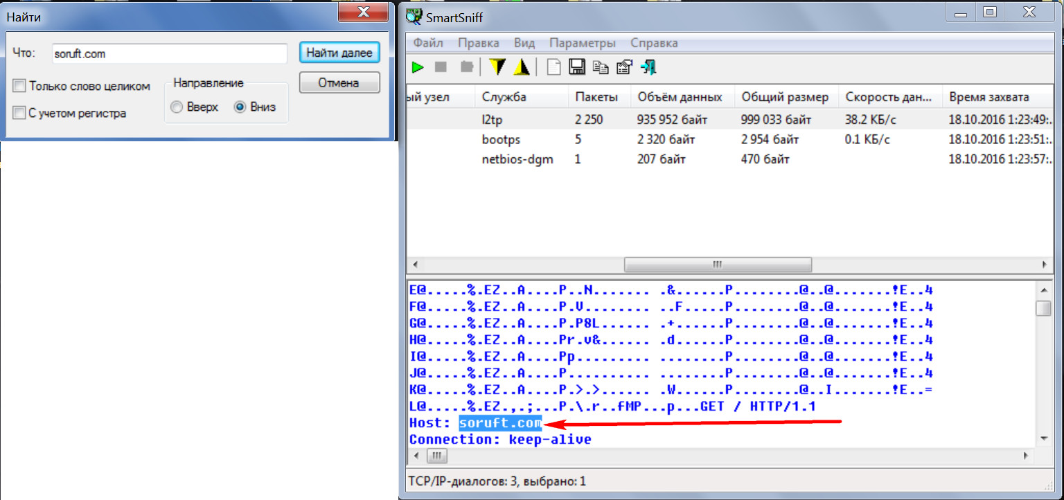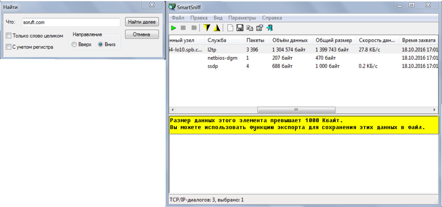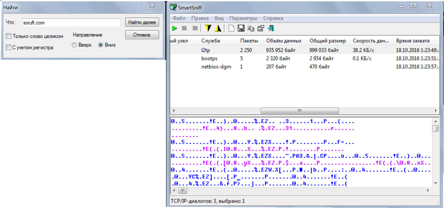 В окно "Найти" ( Рис. 3) вводим название сайта, на который мы хотим зайти, например, сайт "soruft.com". Вписываем его в таком виде только без кавычек. И это маленькое окошко отодвигаем в сторону, чтобы было видно главное окно программы "SmartSniff".