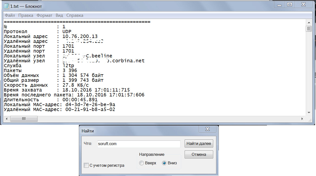 Если VPN шифрует плохо или вообще не шифрует, то в этом текстовом файле мы обязательно найдём наш сайт, как показано на ( Рис. 11):