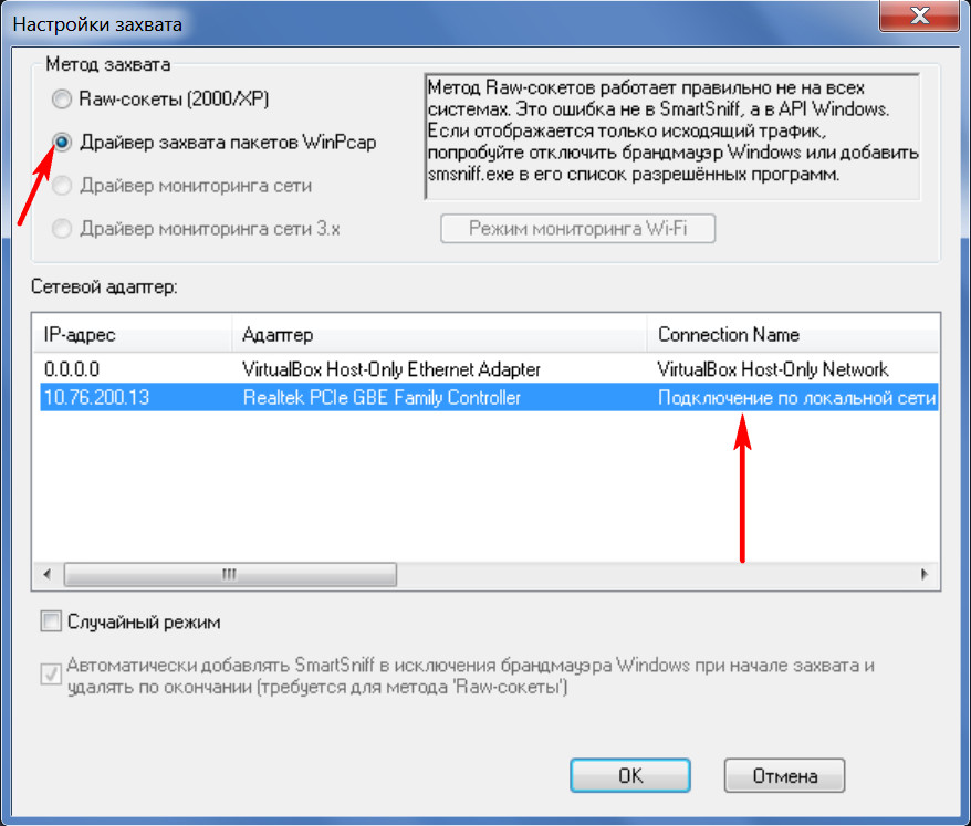 Откроется окно Настроек захвата ( Рис.2 ). Здесь мы отмечаем строчку "Драйвер захвата пакетов "WinPxap". И щёлкаем левой кнопкой мыши по строке "Подключение по локальной сети". Тем самым выбираем адаптер нашей Локальной сети.