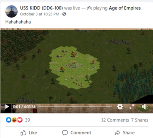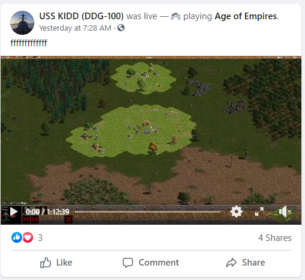 Ранее на этой неделе неизвестный взломал Facebook-аккаунт американского эсминца USS Kidd. На скомпрометированной странице хакер несколько часов стримил, как он играет Age of Empires, причем играл взломщик плохо и не сумел выйти даже из каменного века.
