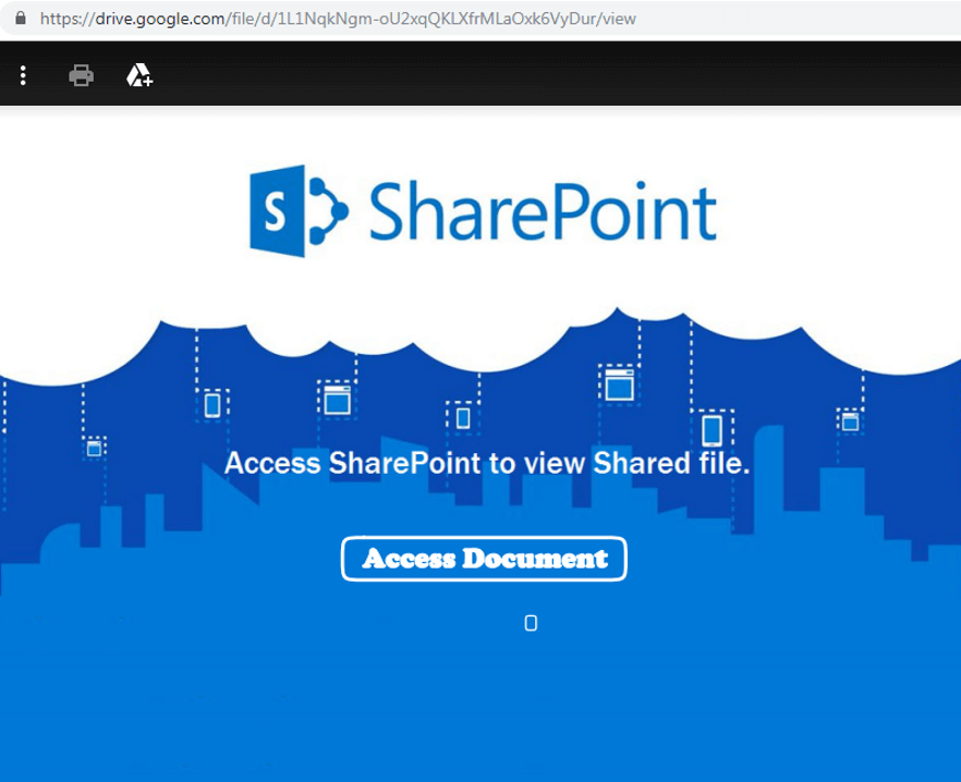 Атака начинается с того, что злоумышленники загружают в Google Drive вредоносный PDF-документ, который содержит ссылку на фишинговую страницу (якобы контент доступен только через SharePoint и поэтому нужно перейти по ссылке).