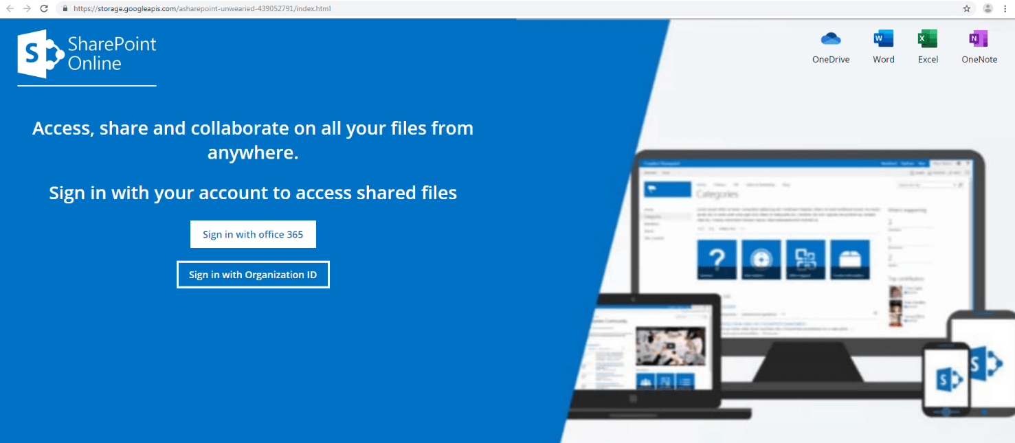 Сама же фишинговая страница размещалась по адресу storage.googleapis[.]com/asharepoint-unwearied-439052791/index.html. Там пользователю предлагалось войти в систему с помощью Office 365 или корпоративной электронной почты. Когда жертва выбирала один из вариантов входа, появлялось всплывающее окно входа в Outlook.