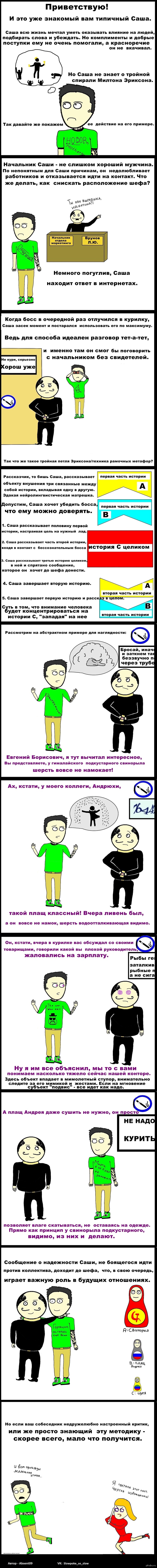 И давайте ещё раз скажем о наиболее важных моментах «Тройной спирали»: запомните, что истории, которые вы рассказываете, не должны быть трудны для восприятия, но должны быть интересны тому, с кем вы разговариваете. Это требуется для того, чтобы сознание вашего собеседника было в состоянии уловить основную суть историй, но, одновременно с этим, пропустило внушаемую информацию дальше – в подсознание.