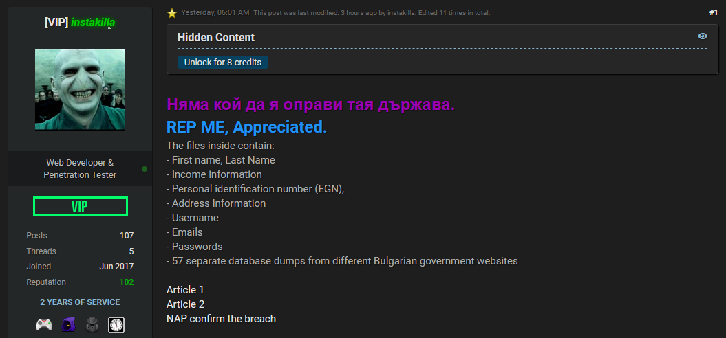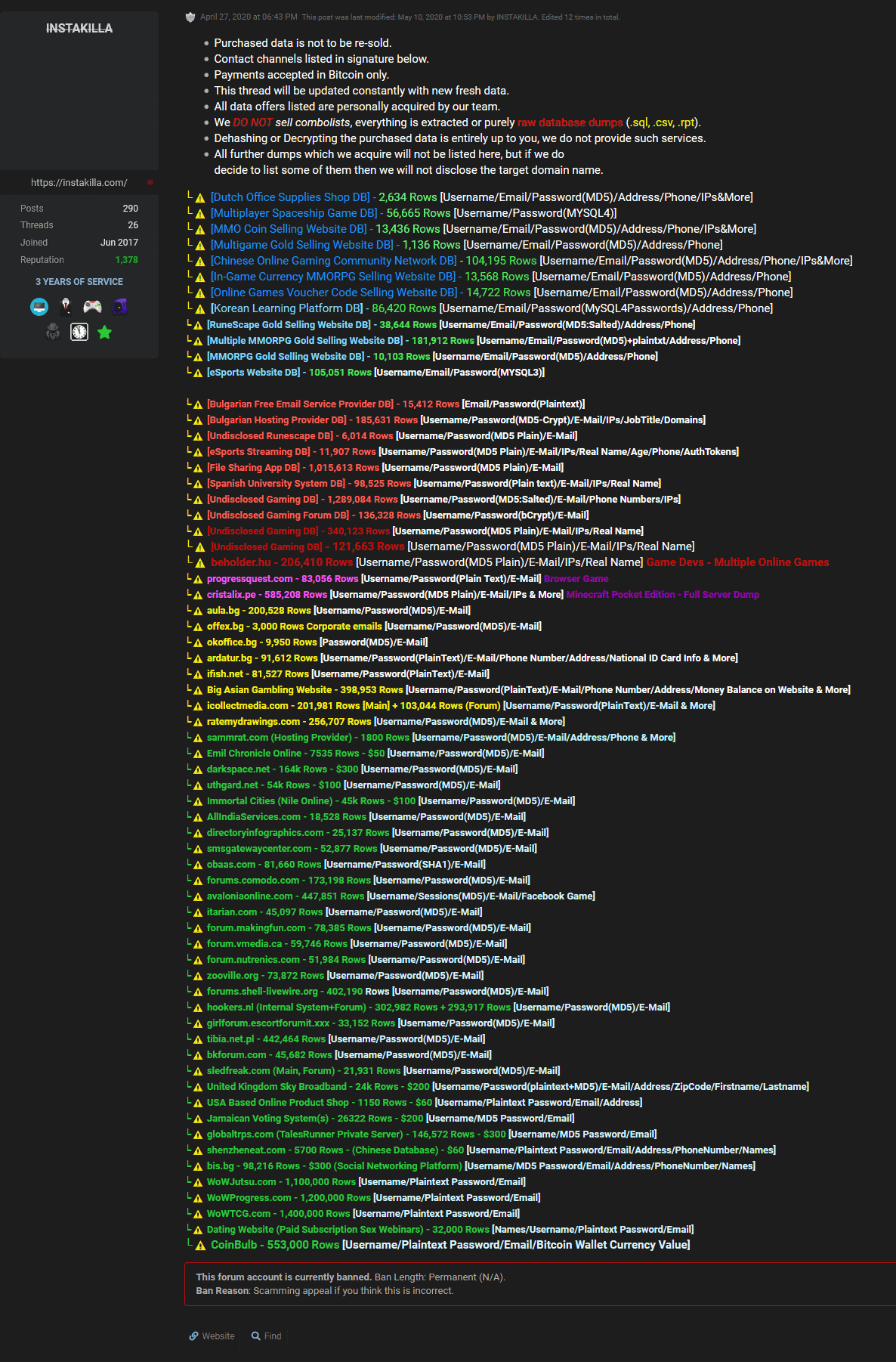 В текущем году Instakilla связывали с крупным взломом форумов Stalker Online, откуда он похитил более 1,2 миллиона пользовательских записей, которые затем выставил на продажу на хакерском форуме. На этом же форуме у злоумышленника было что-то вроде собственного «магазина», где он продавал похищенные у компаний данные (включая две неназванные болгарские организации, местного хостинг-провайдера и сервис электронной почты). Причем в итоге Instakilla забанили на этом форуме за мошенничество.