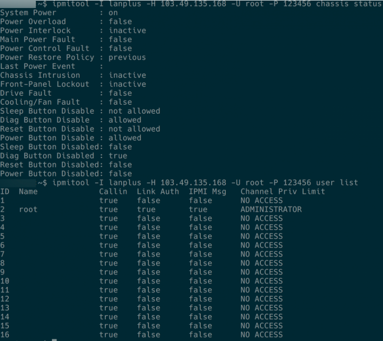 ipmitool -I lanplus -H XXX.XXX.XXX.XXX -U root -P 123456 user list