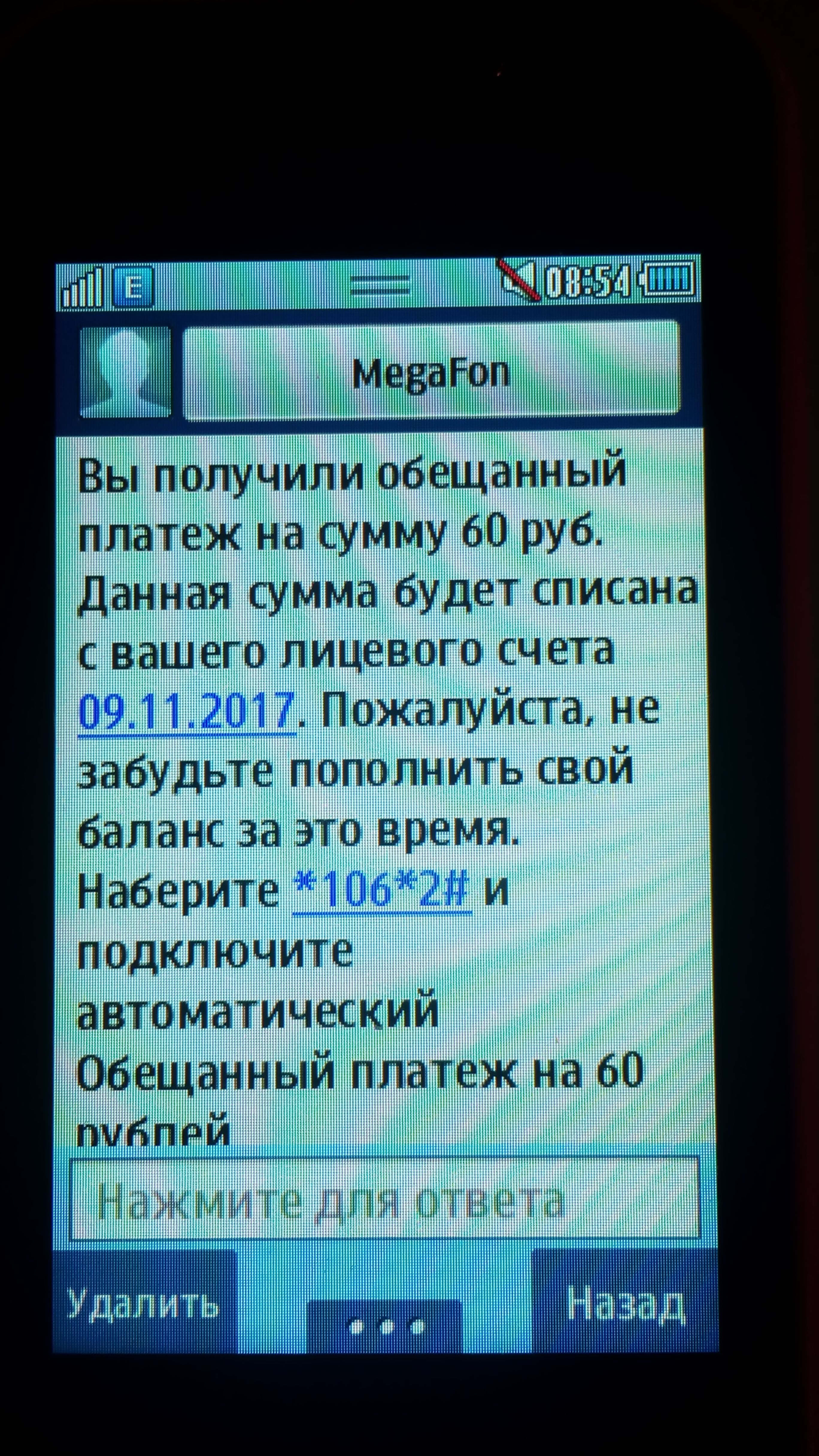 " Обещанный платёж не может быть активирован. Сумма начислений за прошлые месяцы у вас меньше 30р."
