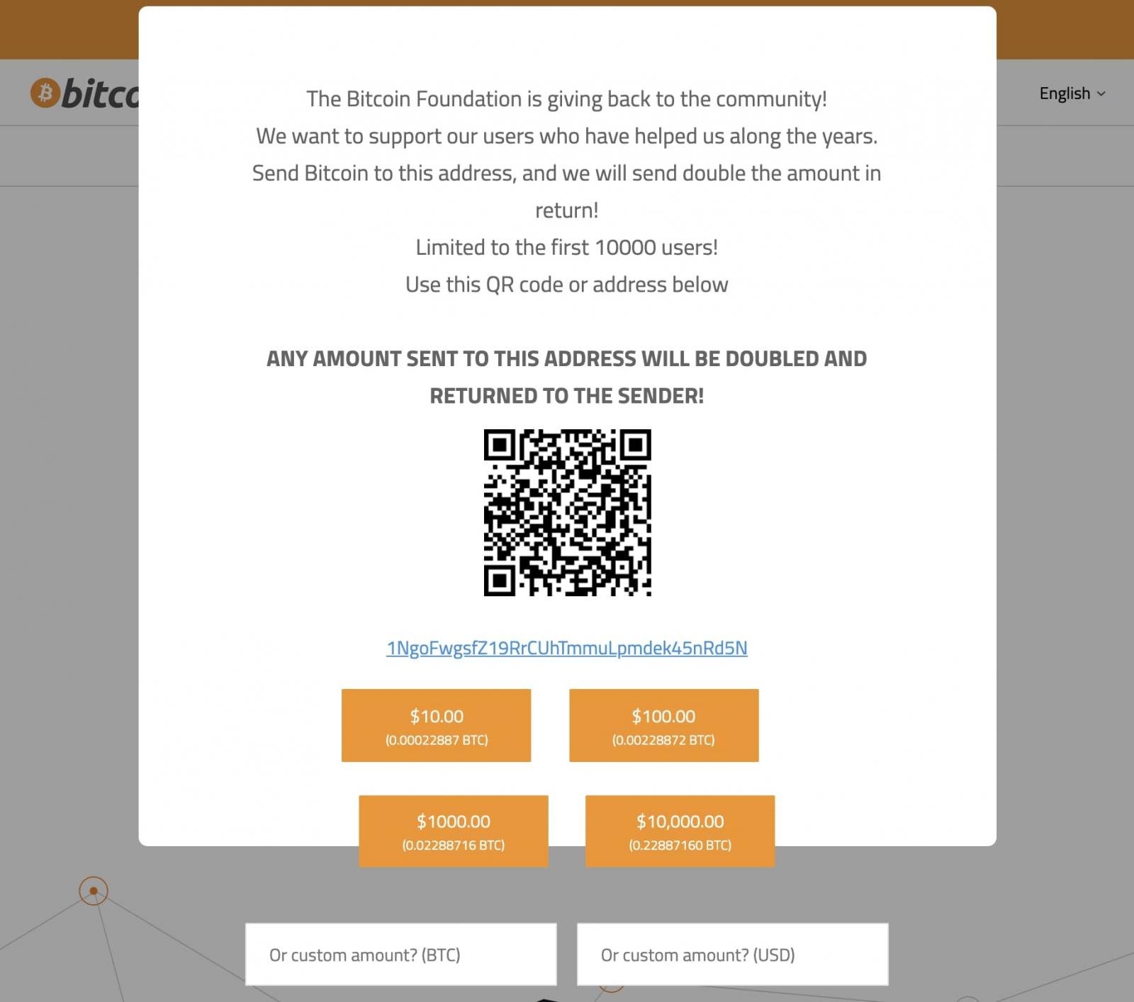«Bitcoin Foundation отплатит сообществу! Мы хотим поддержать наших пользователей, которые помогали нам на протяжении многих лет. Отправьте биткоин на указанный адрес, и мы вернем вам вдвое большую сумму!».