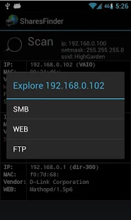 Для обзора HTTP ресурсов запускается браузер, для просмотра SMB используется встроенный SMB клиент (также есть возможность запускать внешний). Для просмотра FTP ресурсов необходим сторонний FTP клиент (например AndFTP).